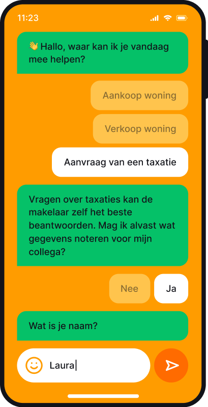 Onze chatbot werkt zoals ieder andere chat, met één belangrijk verschil: de antwoorden zijn geautomatiseerd. Onze chatbot is getraind en kan jouw klanten daarom van het juiste antwoord voorzien. Is er toch contact met de makelaar nodig? Geen probleem! Klantgegevens worden bij de consument opgevraagd en een terugbelverzoek met de vraagstelling wordt naar jullie verzonden. De chatbot zal ook steeds slimmer worden, aan de hand van nieuwe vragen. Zo blijft jouw service op peil en wordt de consument naar wens geholpen.